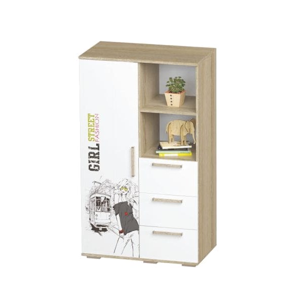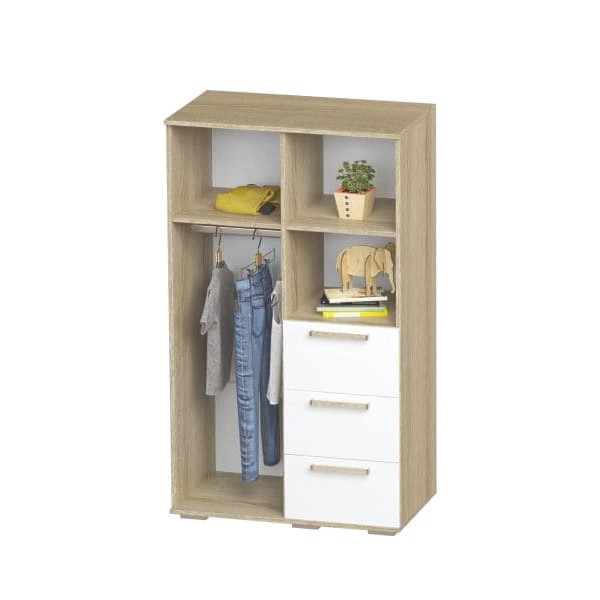 Шкаф многофункциональный ШК-10 "Сенди" имеет закрытое отделение, комплектующееся полкой и штангой для одежды, открытую нишу с полкой и 3 выдвижных ящика.