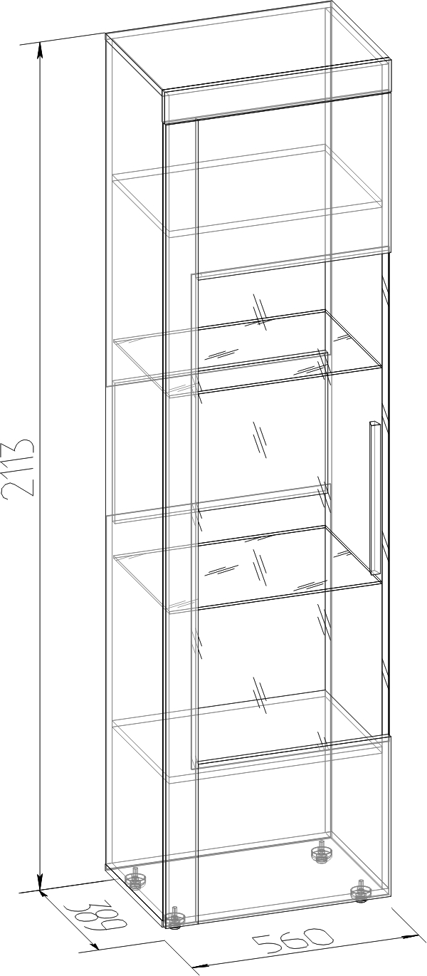 Посудный шкаф со стеклянной дверцей позволит выставить в гостиной те коллекционные и памятные вещицы, которыми вы дорожите. Стеклополки в обработке еврокромкой выдерживают до 10 кг каждая. Их можно декоративно подсветить с помощью светодиодной подсветки (в комплекте не поставляется, приобретается отдельно). Фасад перенавешивается на левую и правую сторону. Серебристая стильная ручка из массива дерева и серое тонирование стекло фасада вносят смелые дизайнерские штрихи в восприятии актуального декора "под бетон".