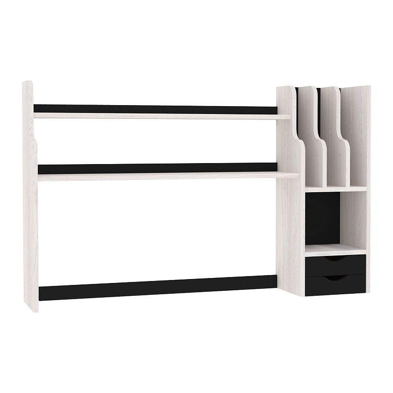 Два небольших ящичка, открытые полки и ниши стеллажа-надстройки к модулю NATURE (НАТУРА) 84 Cтол письменный помогут организовать рабочее место так, чтобы все было под рукой. Надстройка с фигурными закругленными краями может собираться на правую и левую сторону из одного комплекта деталей.
