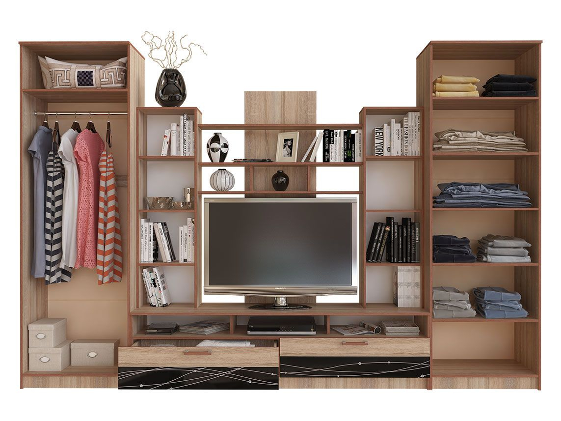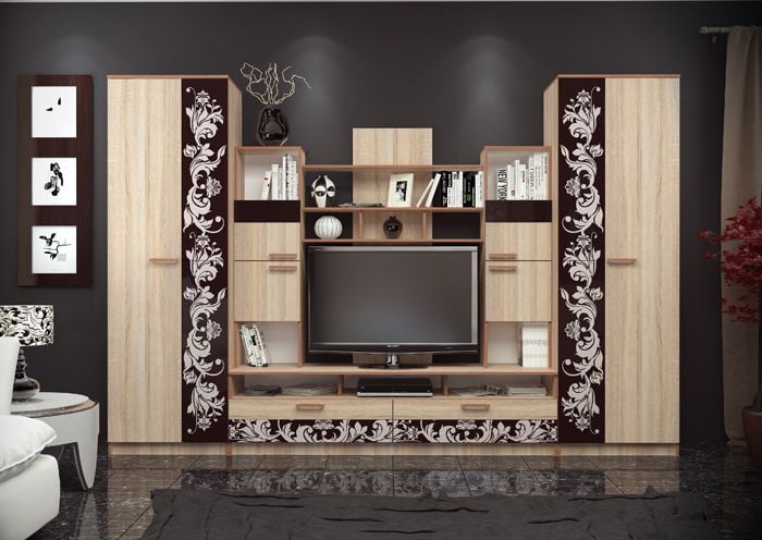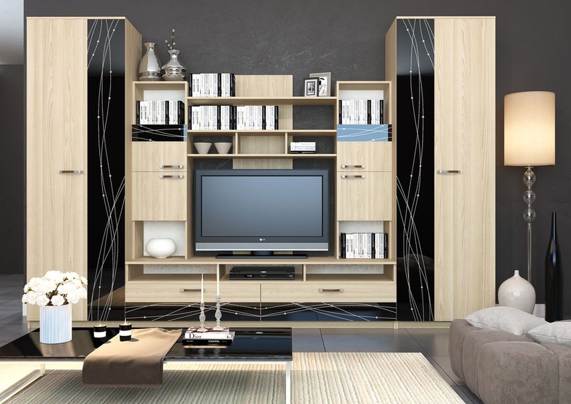 Очень вместительная и функциональная гостиная в новом дизайнерском решении. Одна и таже стенка из-за декоративного стекла может быть как в классическом так и в молодежном стиле.