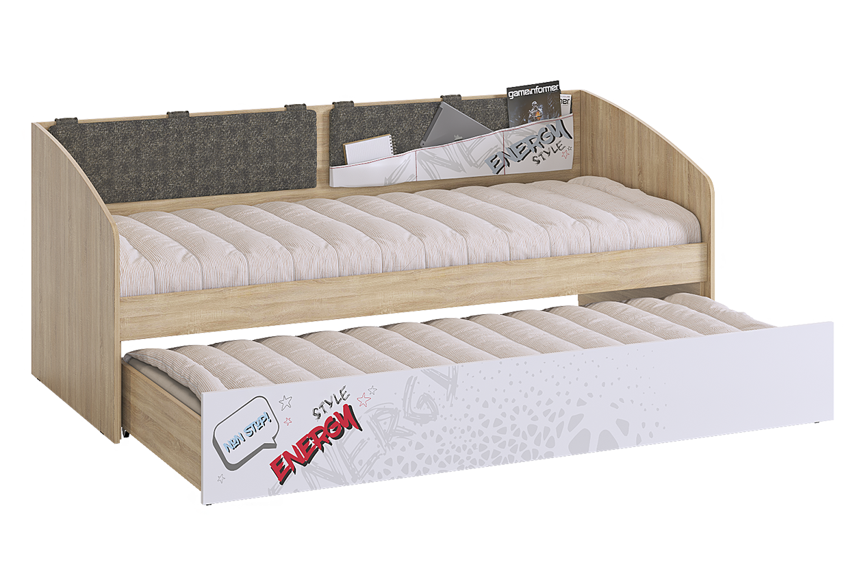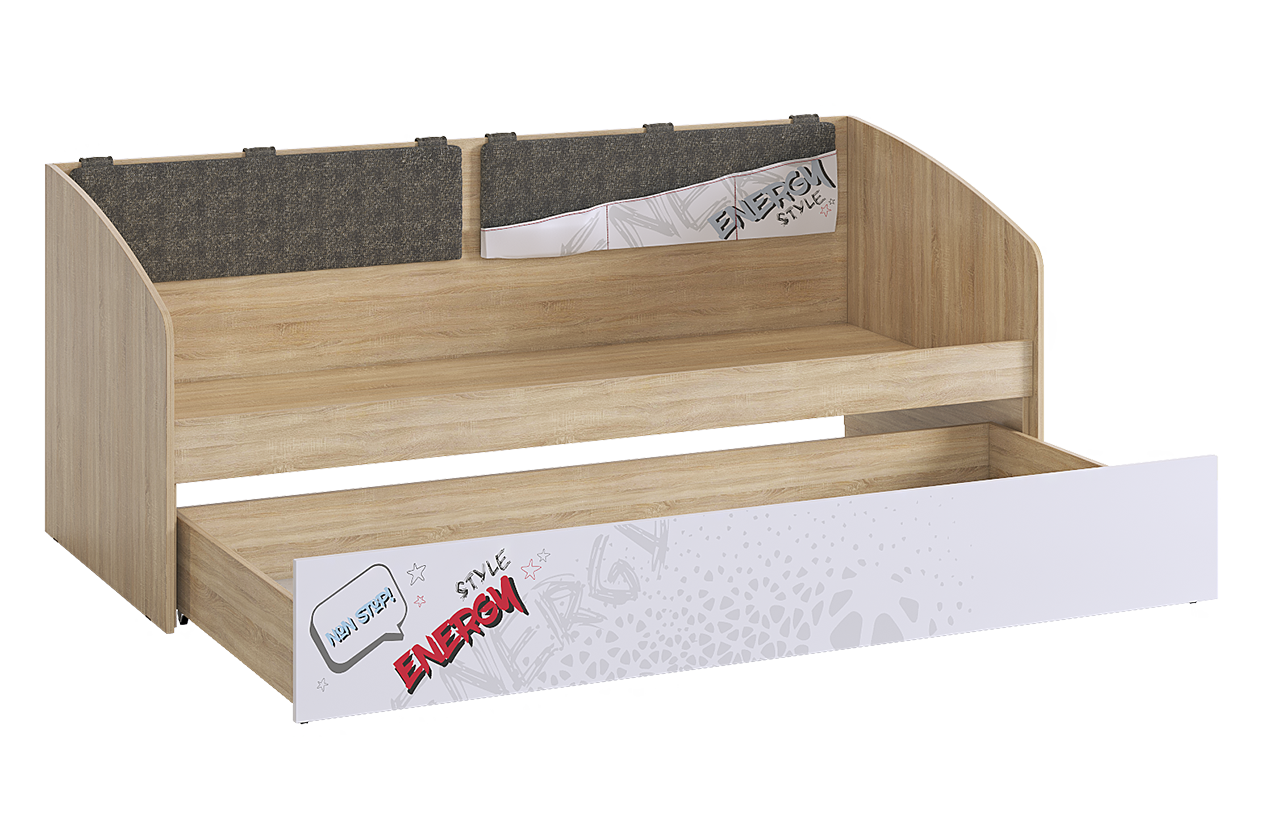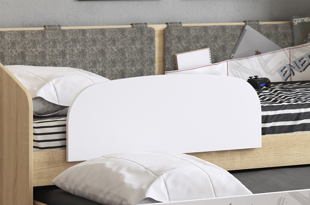 Эта кровать станет ярким элементом интерьера в комнате вашего ребенка. Просторный ящик для хранения белья также может служить дополнительным спальным местом. Мягкие накладки на спинке добавляют уют и комфорт.