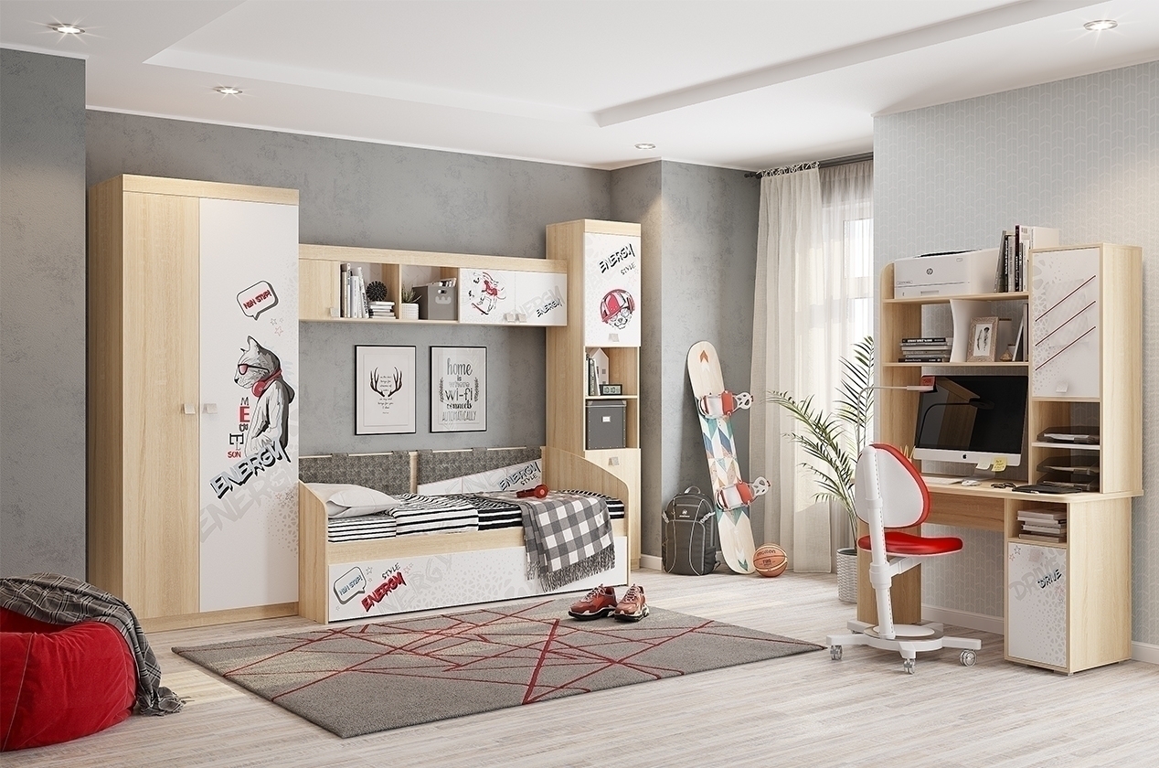 Детская «Энерджи» - это стильная, современная детская, которая понравится каждому ребенку. Рисунок устойчив к истиранию и ультрафиолету. Стильный принтерный рисунок на фасаде, и карманах. Чехлы подушек съемные, что позволит обеспечить чистоту и порядок.