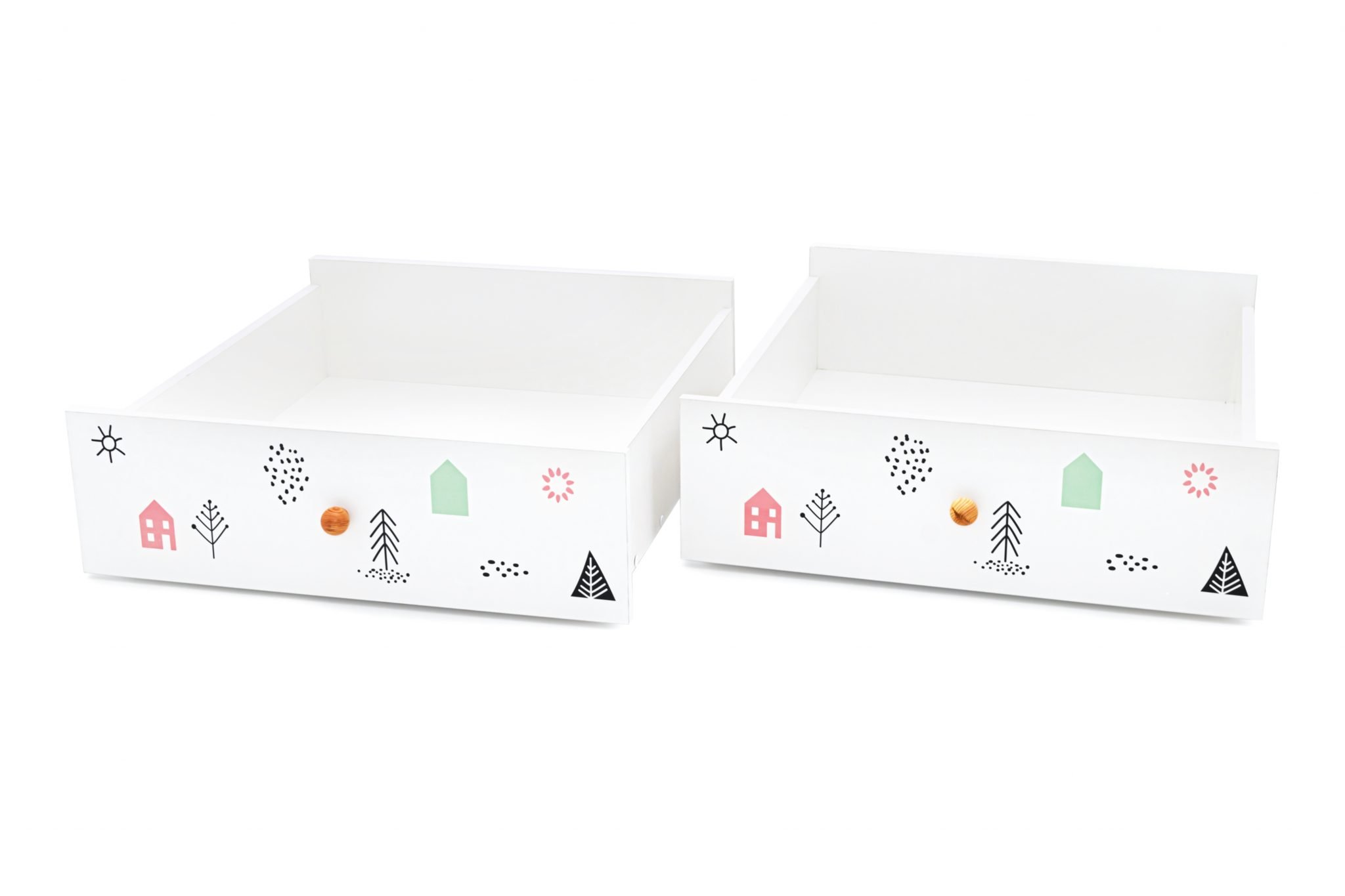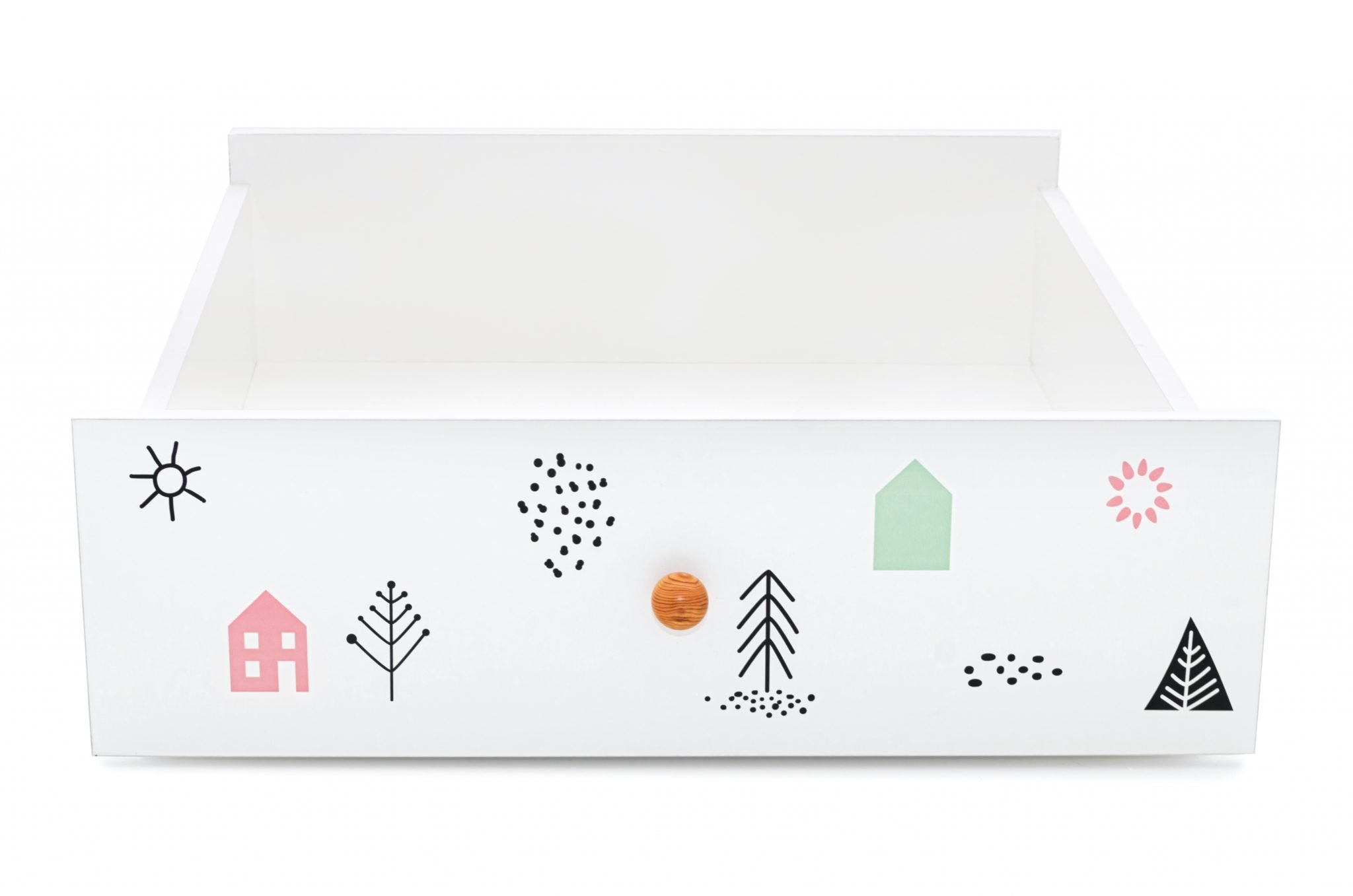 Ящики на колесиках удобны, когда нужно помыть полы под кроваткой или переставить ее с легкостью на другое место. Ребенок сможет самостоятельно при необходимости выдвинуть и задвинуть ящик. Ящик объемом 0,6 куб.м. отлично подойдёт для хранения постельного белья, игрушек и других вещей. Большой выбор фотопечати на фасадах ящика позволят создать свою идеальную кровать.
