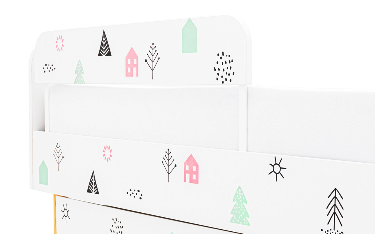 Бортик выполнен из ЛДСП класса Е1. На поверхность нанесен оригинальный рисунок ультрафиолетовыми высококачественными чернилами. Рисунок, нанесенный с помощью фотопечати устойчив к истиранию. Все материалы экологичны и безопасны. Крепежи из металла.