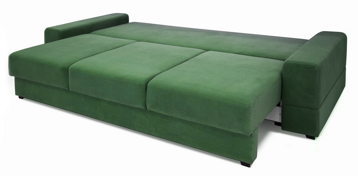 Диван имеет систему трансформации «тик-так». Так же диван укомплектован тремя большими подушками в единой ткани с диваном. Состоит из дивана со спальным элементом и оттоманки. Имеет 2 вместительных короба для хранения