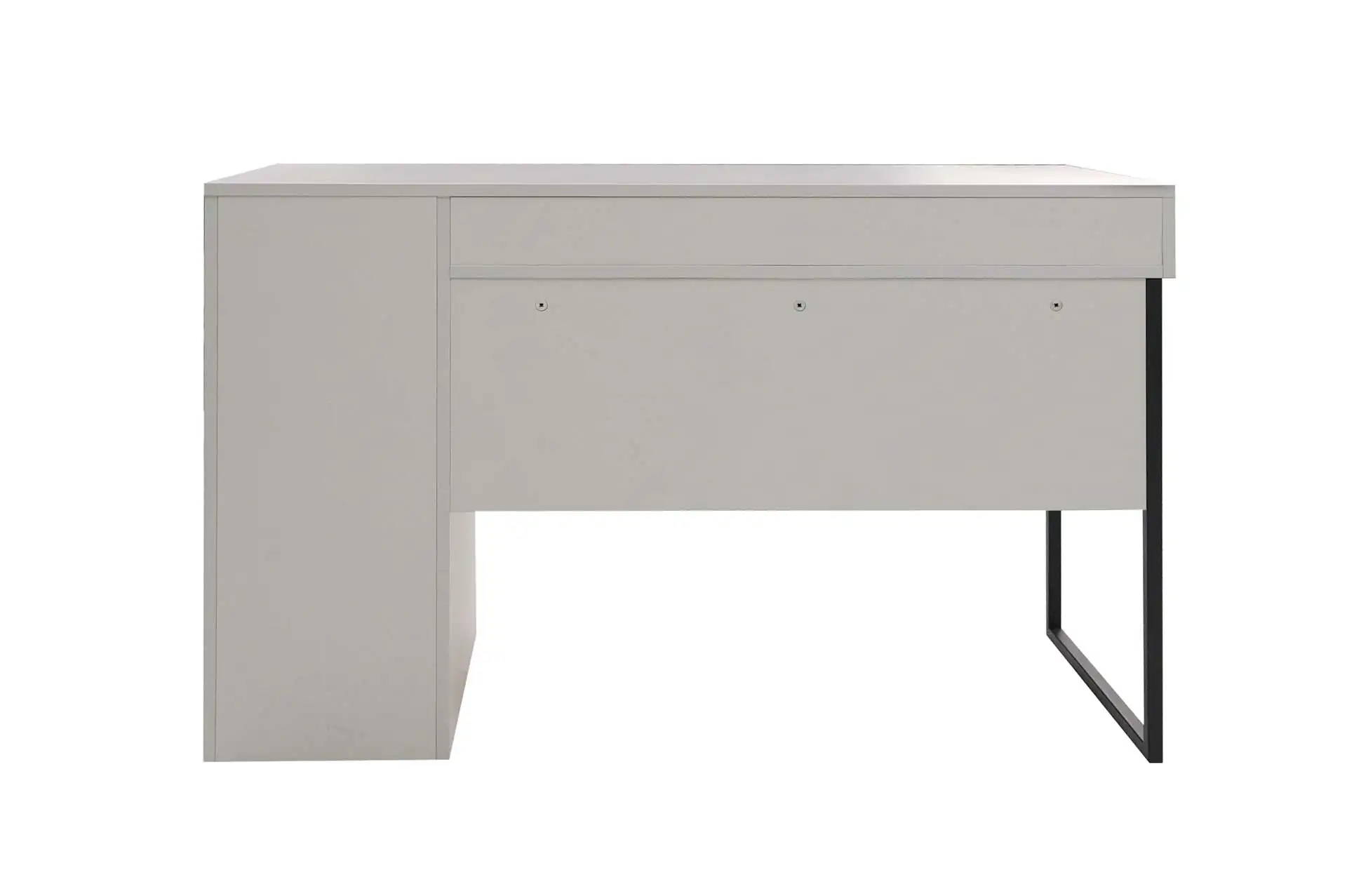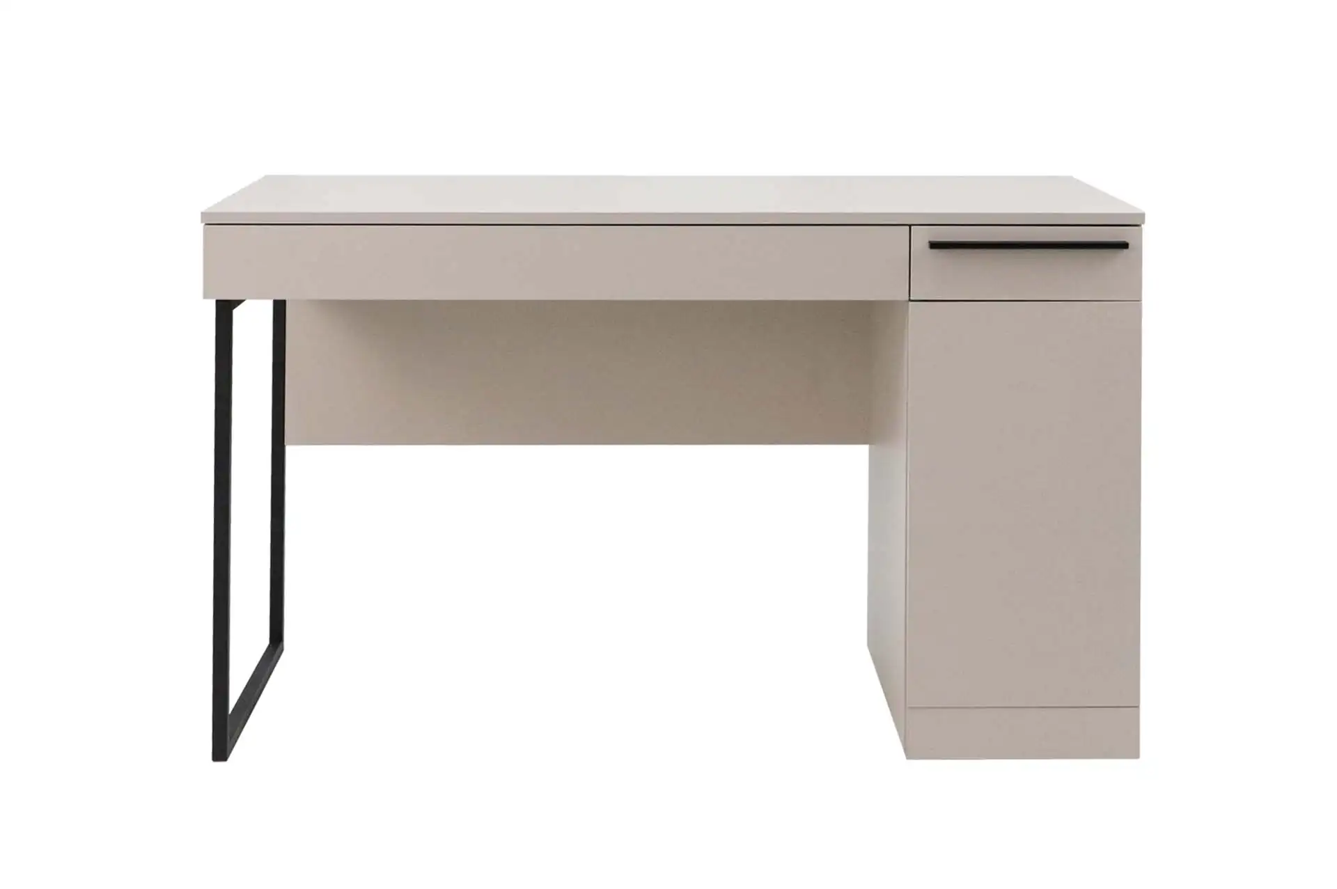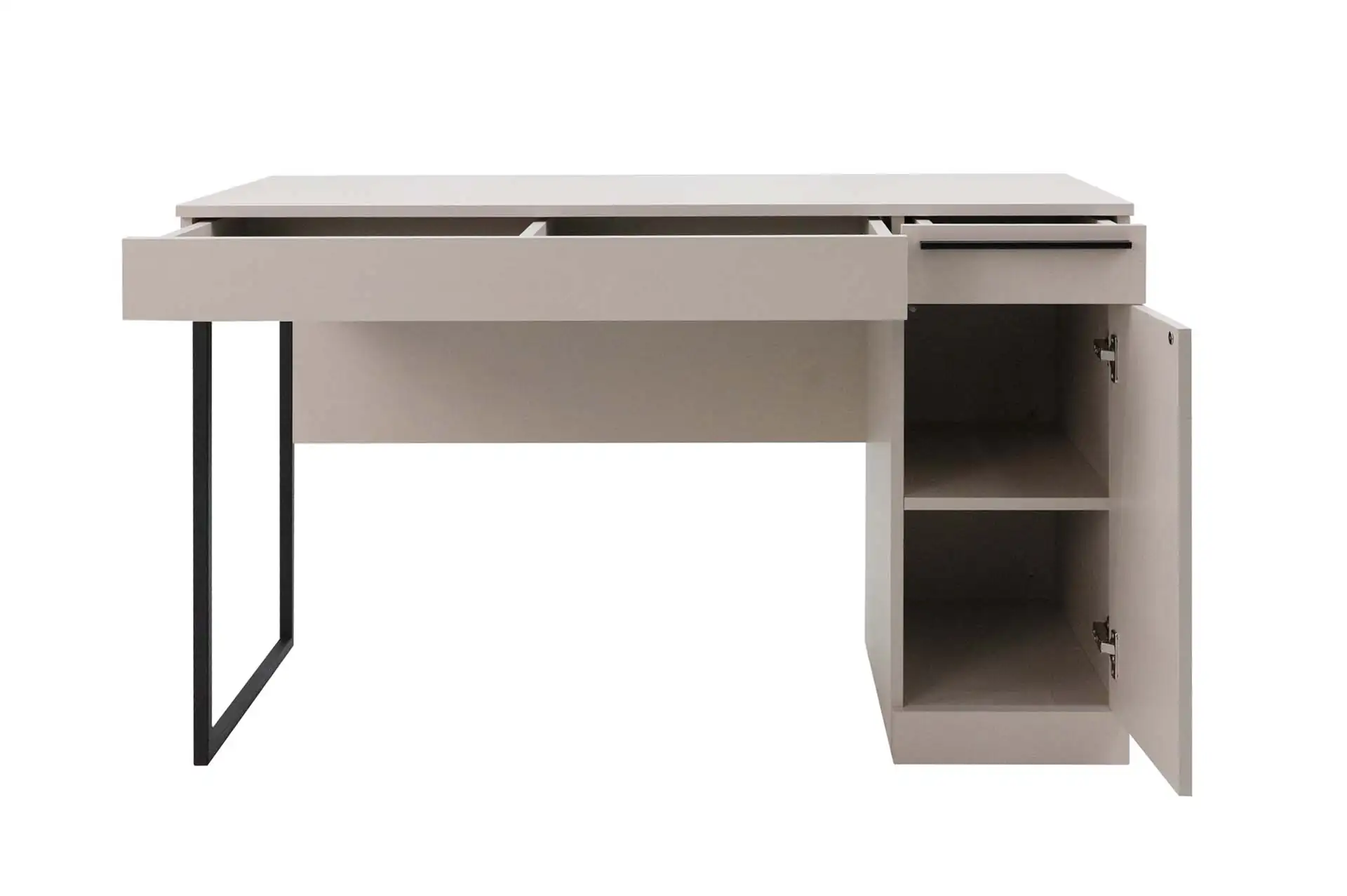 Стол письменный выполнен в популярном цвете кашемир. В тумбе установлен выдвижной ящик и полки для хранения. Имеется возможность выбора стильной металлической опоры и ручки для ящика в цвете сатиновое золото или в лаконичном черном цвете.