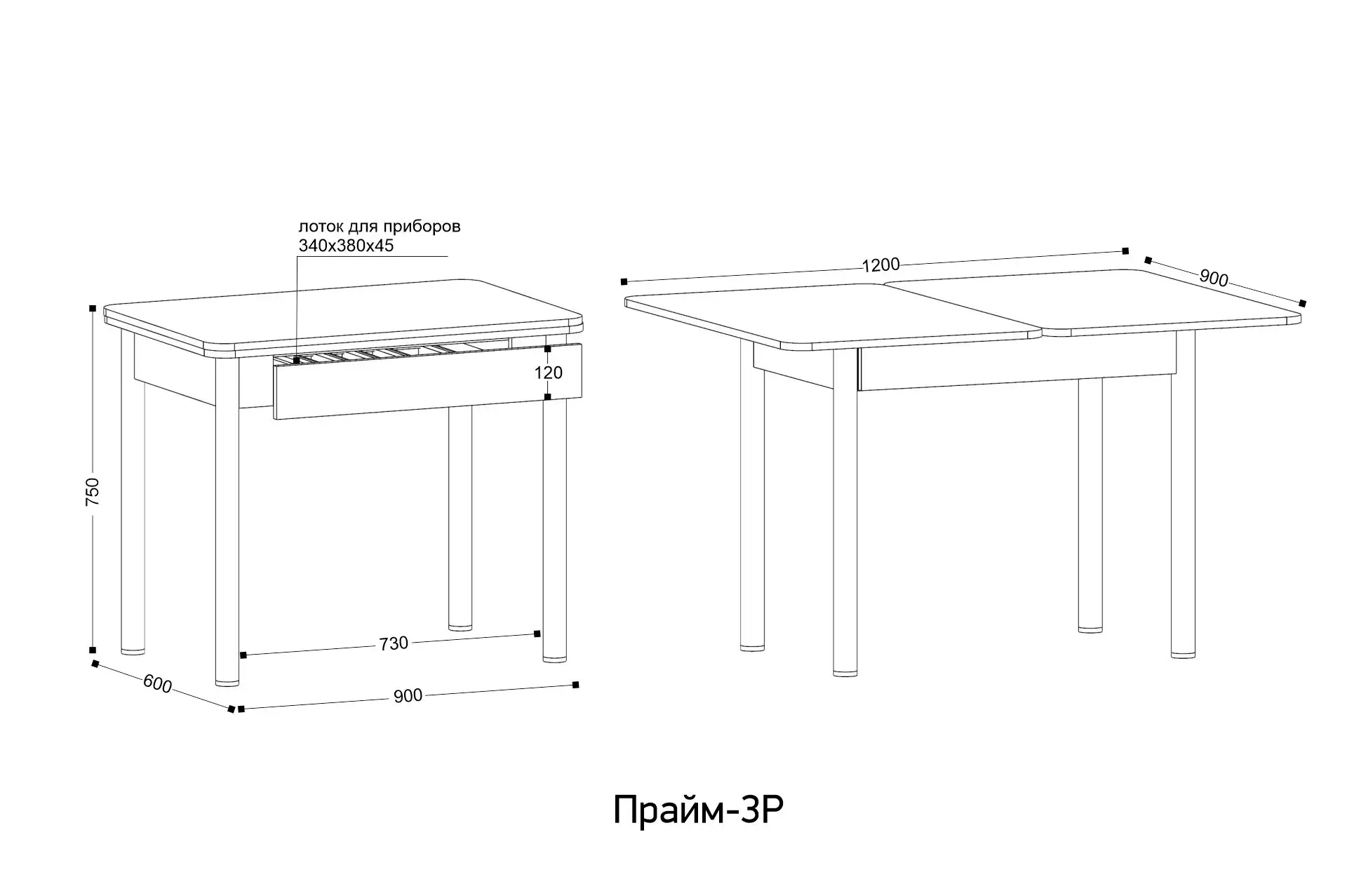 Ширина: 600-1200 мм | Глубина: 900 мм | Высота: 750 мм