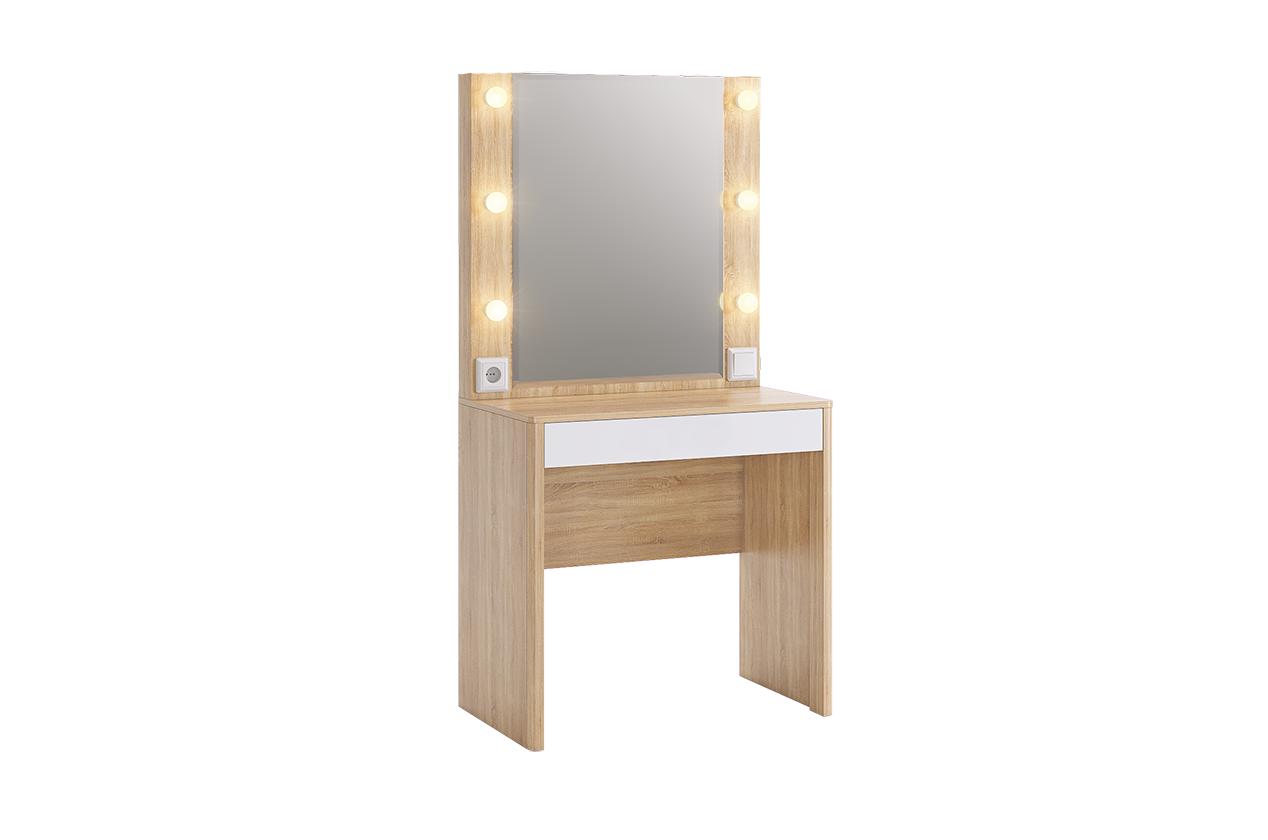Оригинальное и стильное трюмо из серии «Зара». В зеркало с широким фацетом, встроена подсветка, как в столах профессиональных визажистов. Дополнительно имеется выключатель, розетка для фена и выдвижной ящик для украшений и косметики. Закругленные углы, подчеркивают общий стиль коллекции.